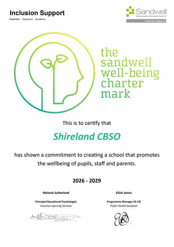 Achieving the Wellbeing Charter Mark reflects Shireland CBSO Academy’s holistic approach, balancing academic ambition with a strong focus on personal development and pastoral care. It also highlights the Academy’s commitment to creating a community where wellbeing is at the heart of its ethos.